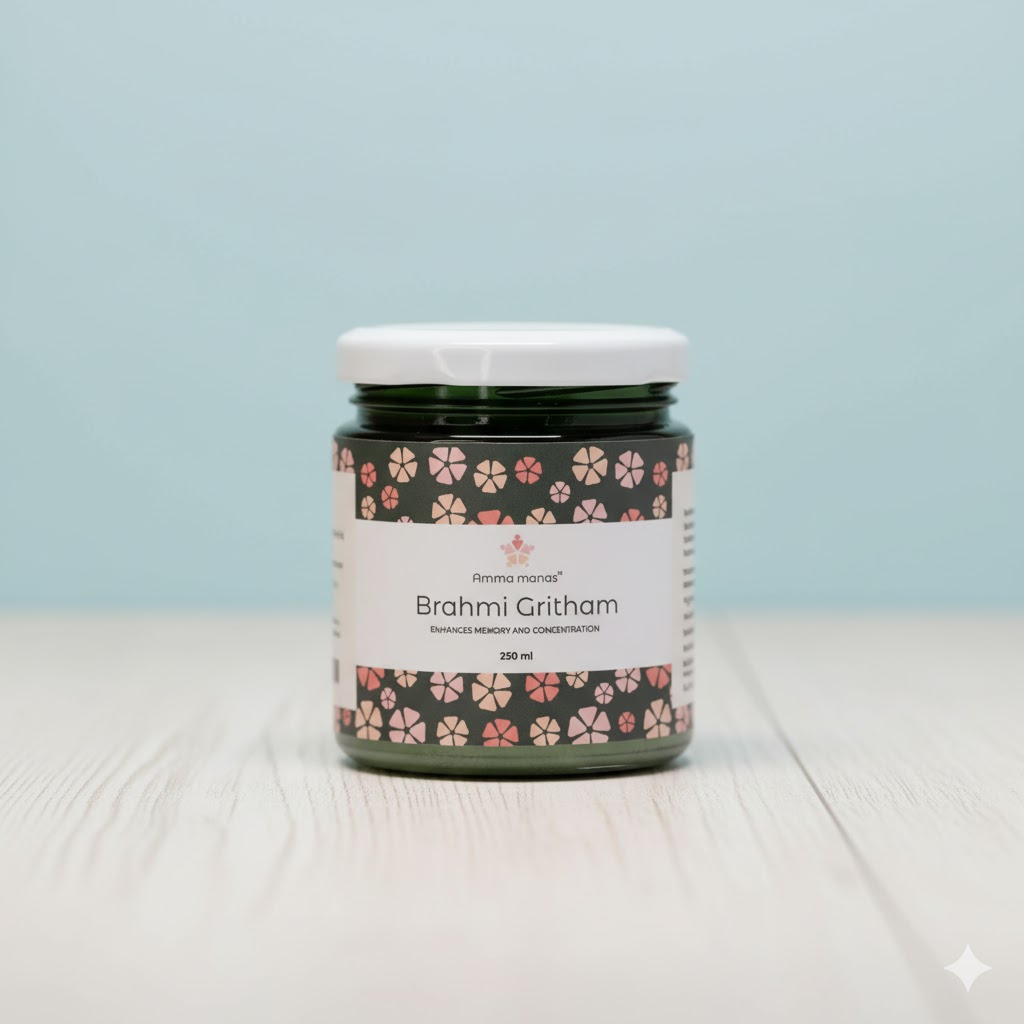 Brahmi Ghritham 250ML is a classical Ayurvedic medicated ghee formulated with Brahmi and other herbs to support cognitive health. It helps improve memory, focus, learning ability, and mental clarity while nourishing the nervous system.