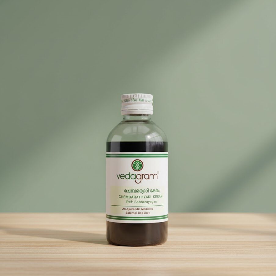 Chemparuthyadi Keram is a traditional Ayurvedic coconut oil infused with hibiscus and herbal extracts. It helps strengthen hair, reduce dandruff, cool the scalp, and promote healthy hair growth.