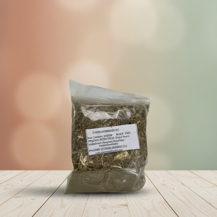 Cheru Nimbadi KC is a traditional Ayurvedic coconut oil processed with neem and other herbs to support healthy, clear skin. It helps soothe itching, reduce inflammation, and maintain skin hygiene.