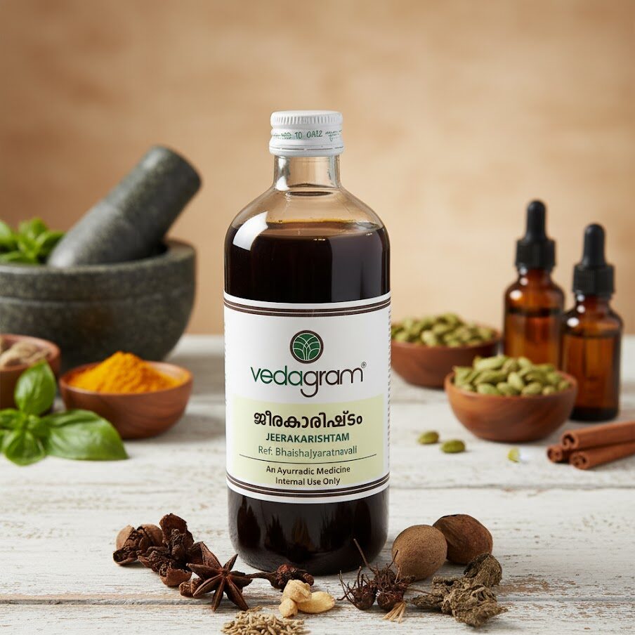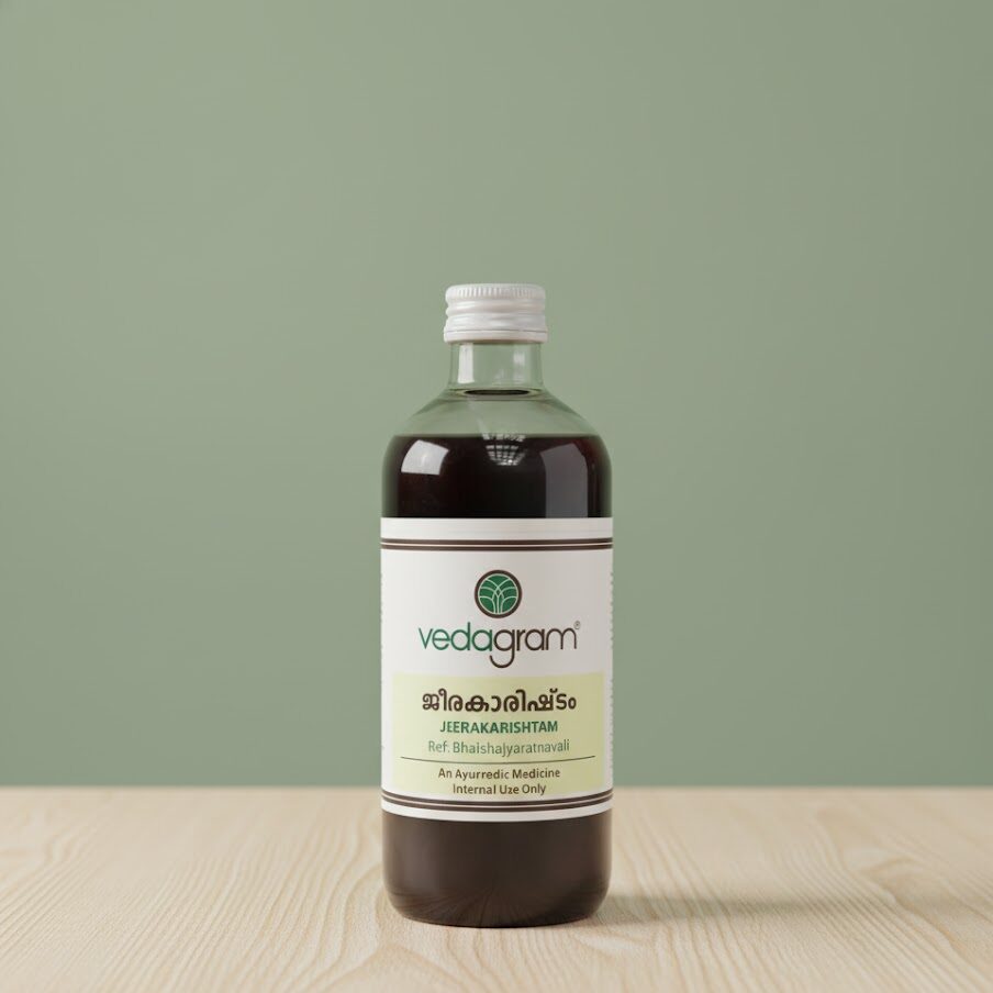 Jeerakarishtam is a traditional Ayurvedic digestive tonic prepared with Jeeraka (cumin) to support digestion, improve appetite, and promote postpartum wellness. It helps reduce bloating, enhances metabolism, and strengthens overall vitality.
