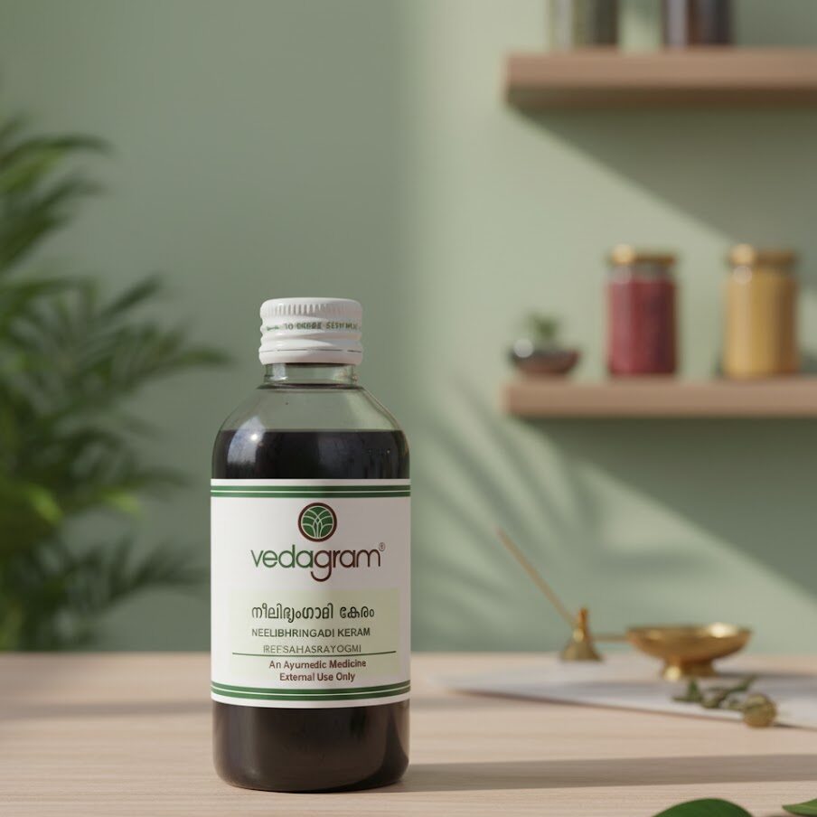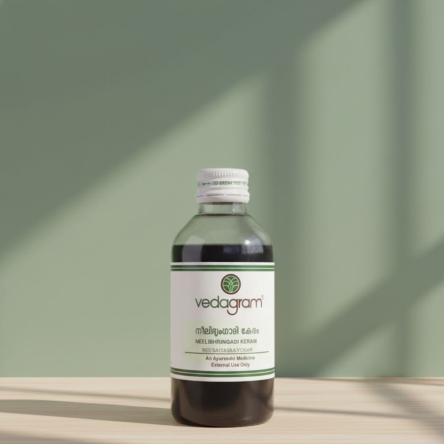 The Neelibringadi keram is a luxurious blend of coconut oil and precious ayurvedic herbs like indigo or neeli, false daisy, also called bringaraj, winter cherry, or karnasphota, and gooseberry, commonly called amla is formulated to cover all your hair and scalp concerns such as dandruff, premature greying, and hair fall.