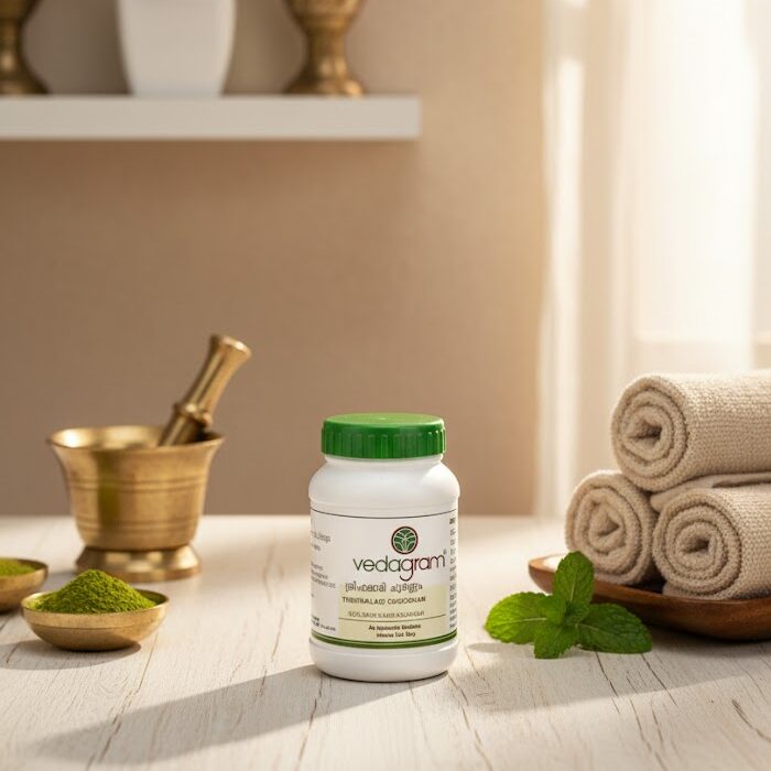 Thripaladi Choornam is a traditional Ayurvedic herbal powder formulation known for its digestive and detoxifying properties. It is commonly used to support gastrointestinal health, improve digestion, and alleviate conditions like bloating, gas, and constipation.