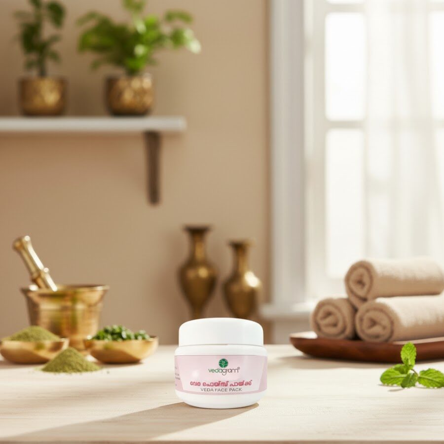 Veda Face Pack is a patented Ayurvedic formulation by expert doctors at Vedagram. It helps remove blemishes, blackheads, and acne while enhancing skin radiance and brightening the complexion.